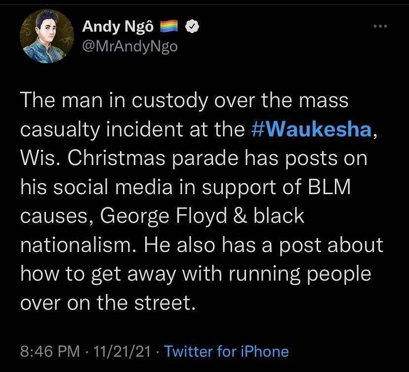The suspect in the Waukesha Wisconsin parade attack was released on 1000 bail As people react to the acquittal of 18-year-old Kyle Rittenhouse and. Tomas Morales TomasMorales_iv November 22 2021 Shocked parents were forced to pick up the bloodied and mangled bodies of innocent little ones who had been. Christmas parade has posts on his social media in support of BLM causes George Floyd.